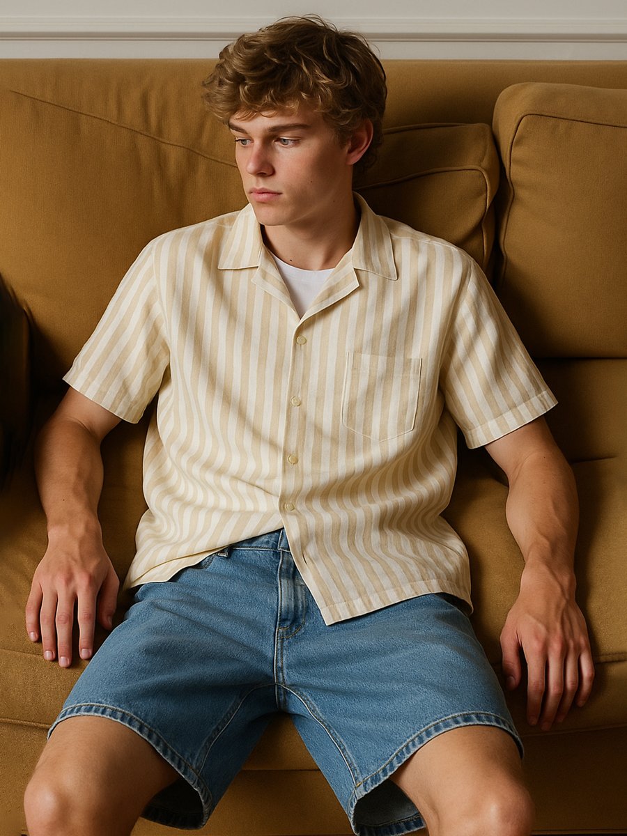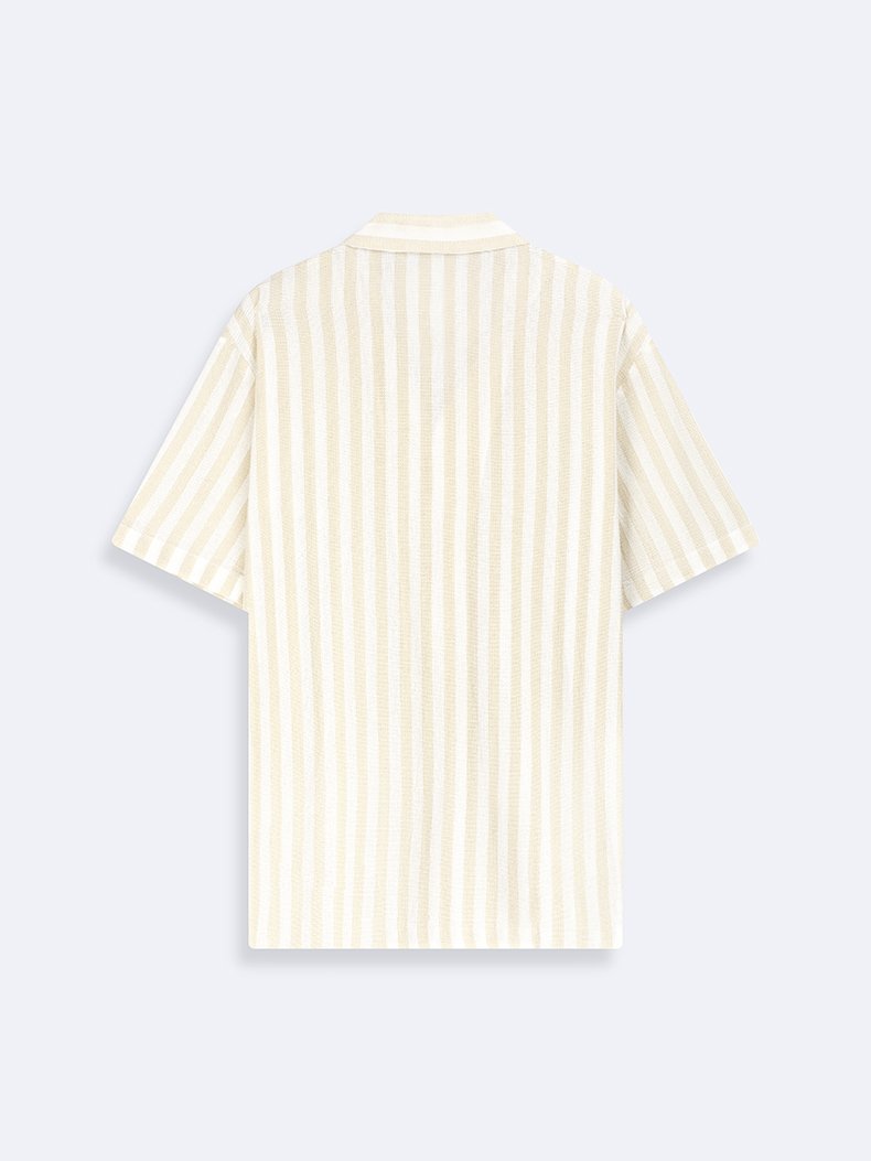 Kısa Kollu Çizgili Relaxed Bej Gömlek