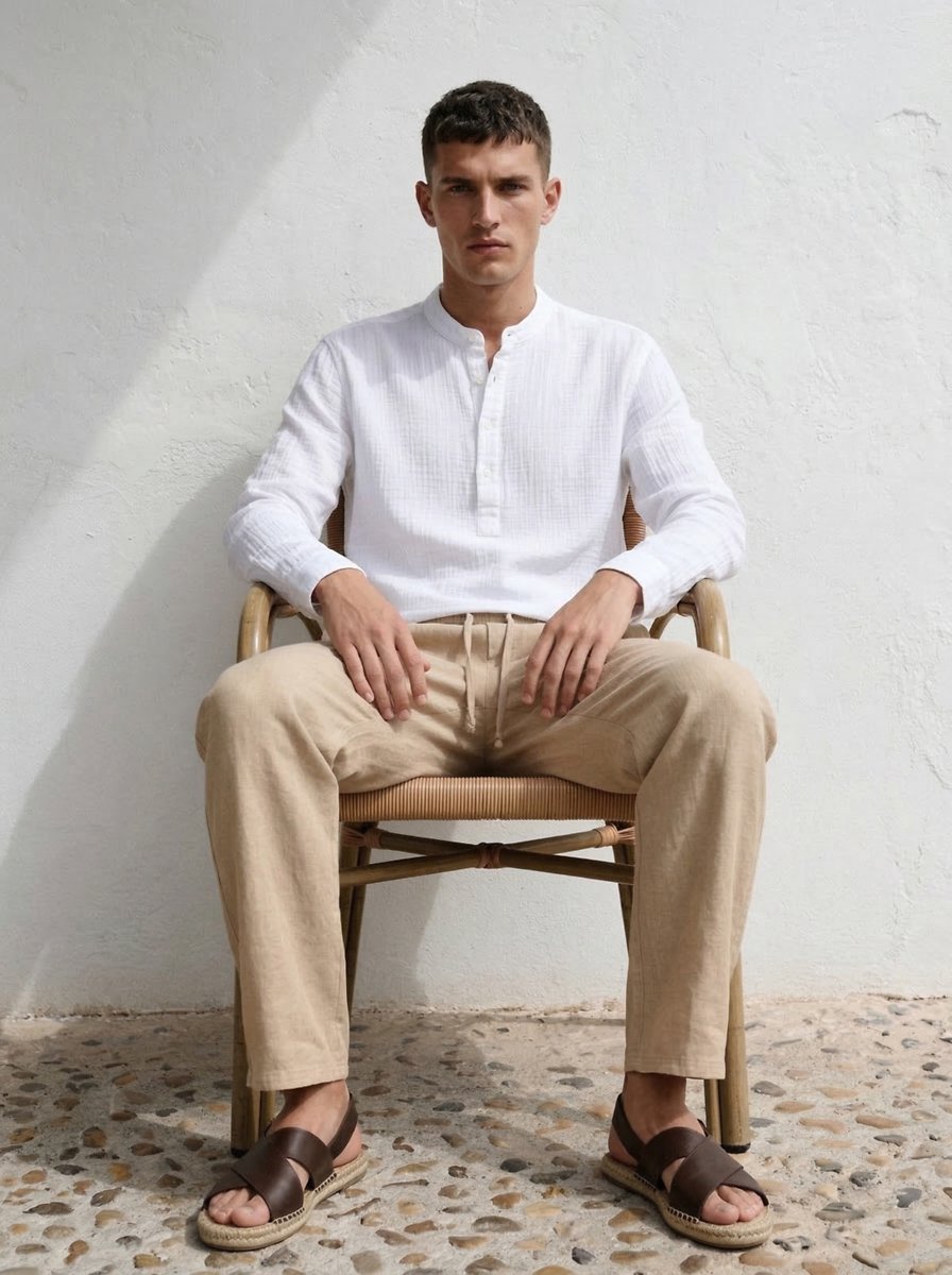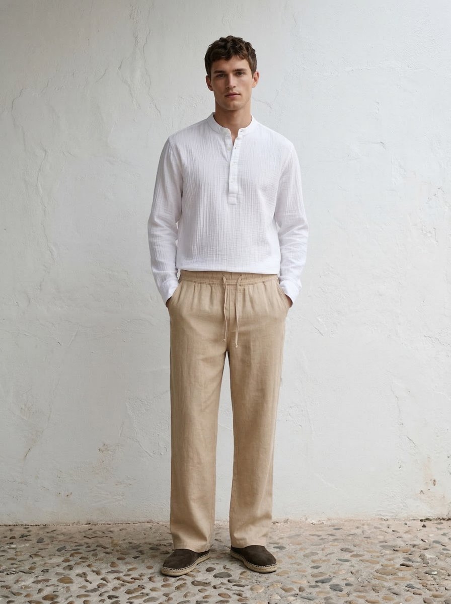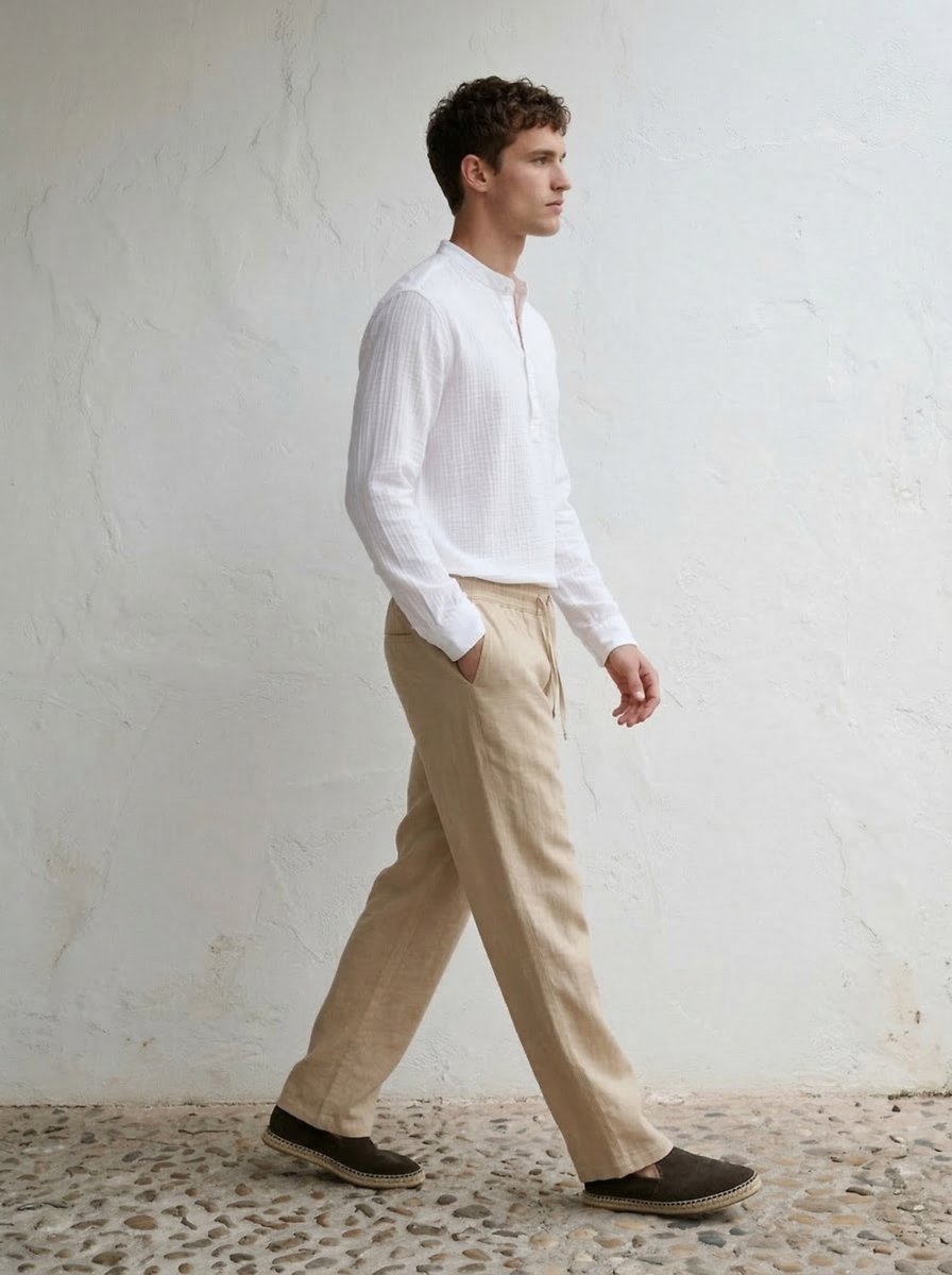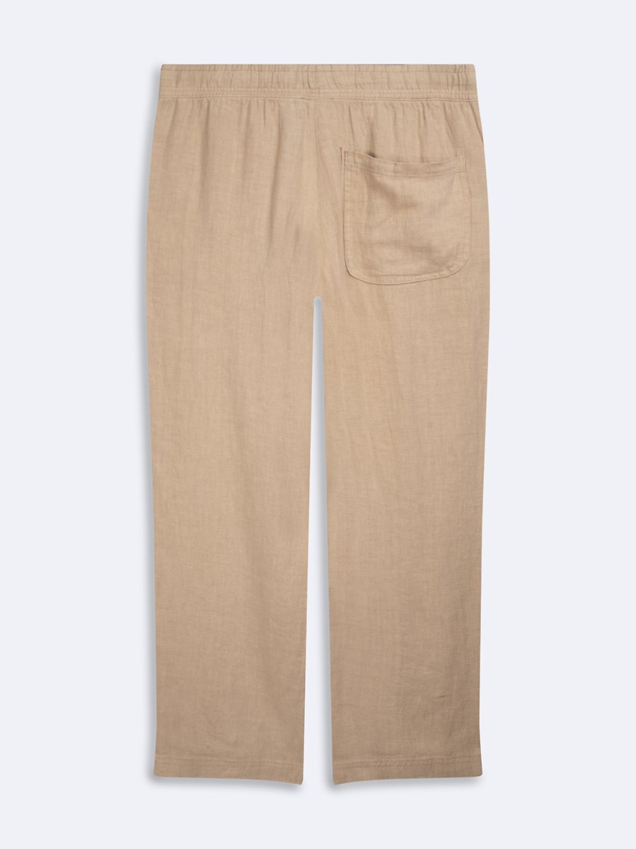 Beli Lastikli Düz Paça Keten Bej Pantolon