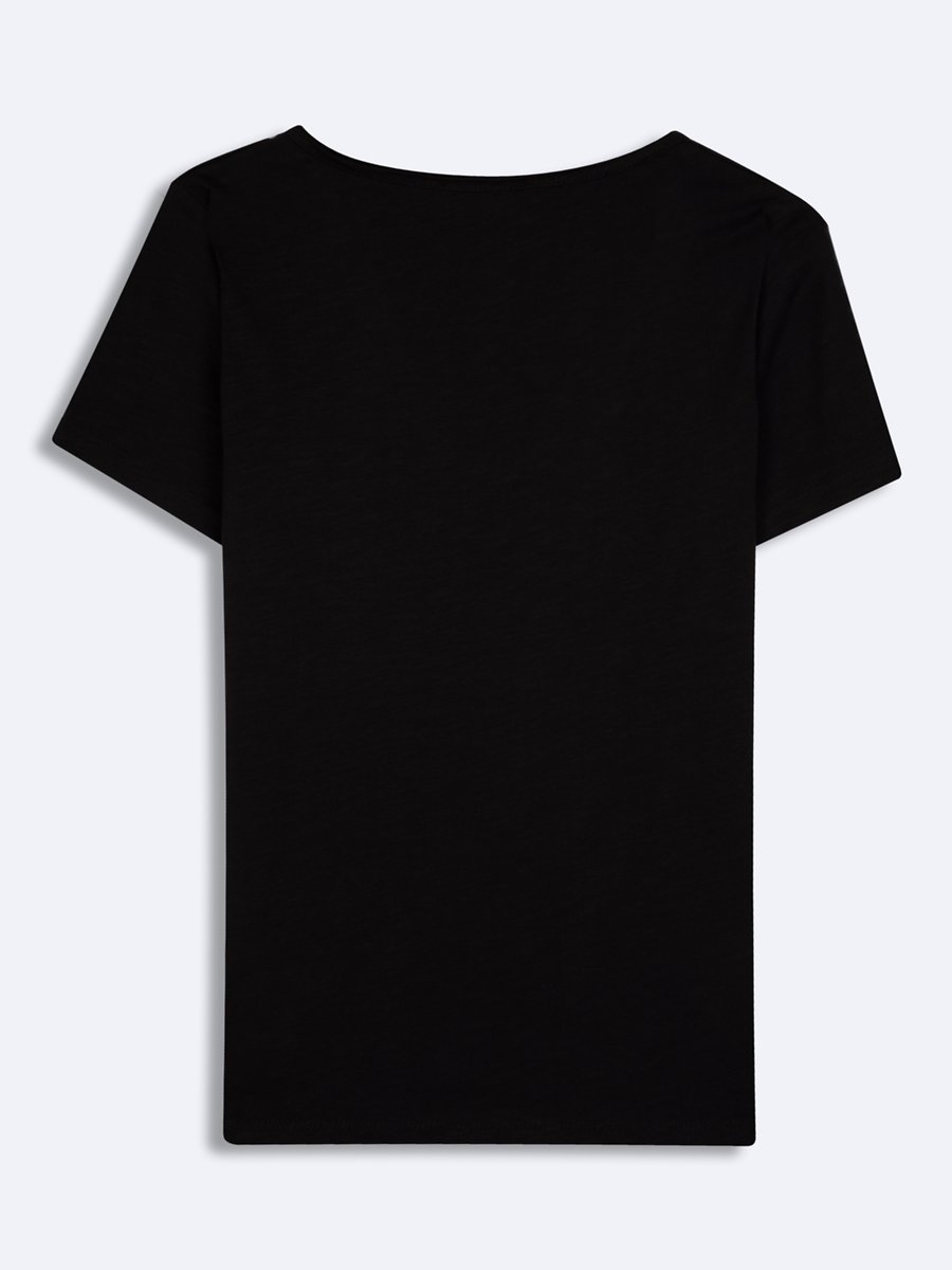 Kesik V Yaka Flamlı Siyah T-shırt