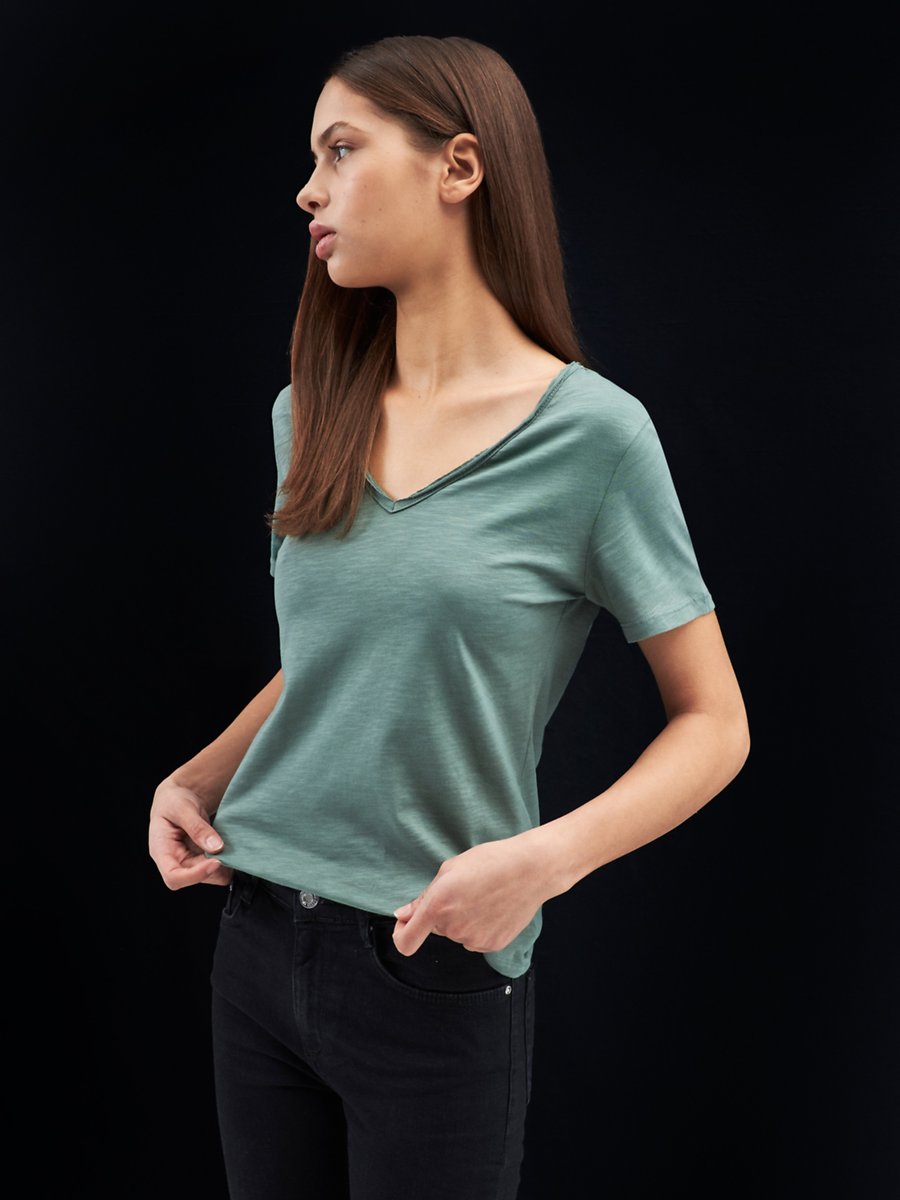 Kesik V Yaka Flamlı Yeşil T-shırt