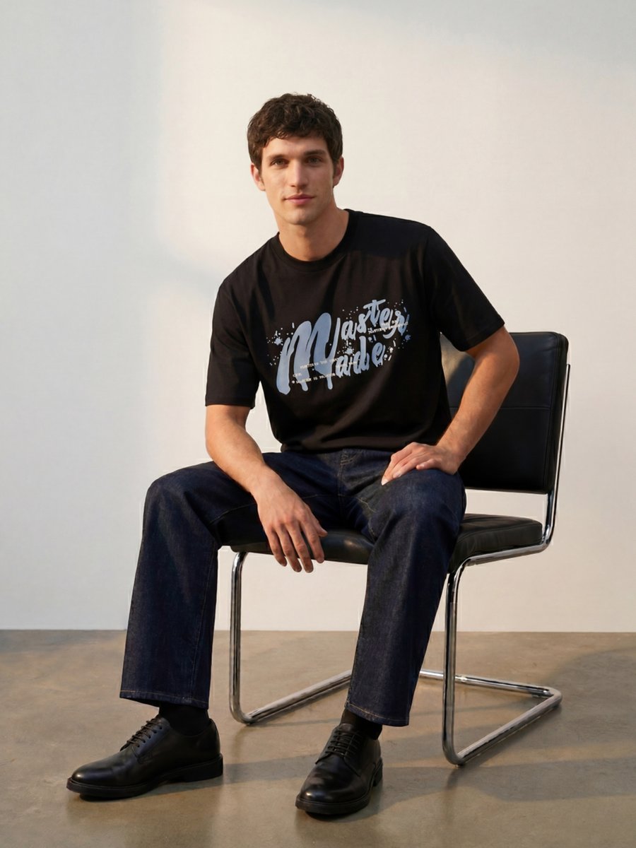 Bisiklet Yaka Baskı Detaylı Siyah T-shırt