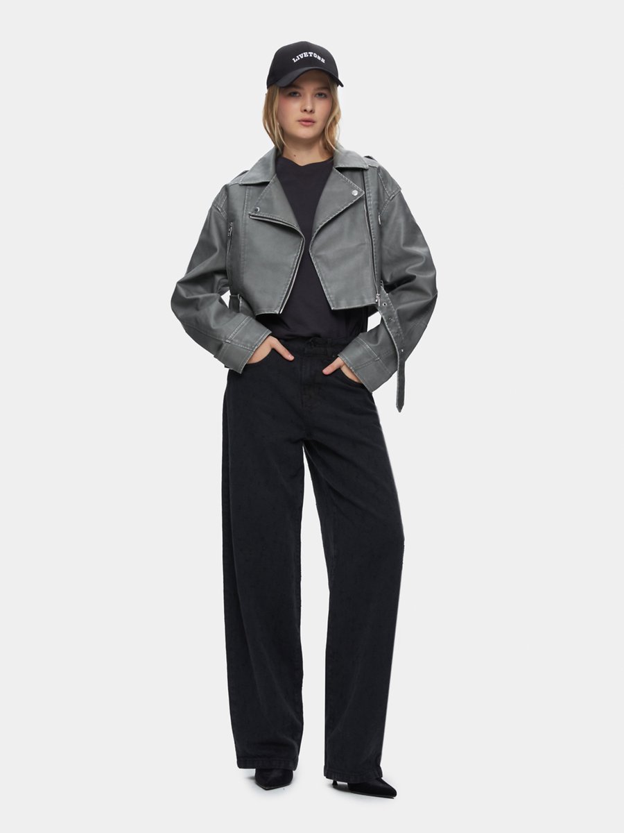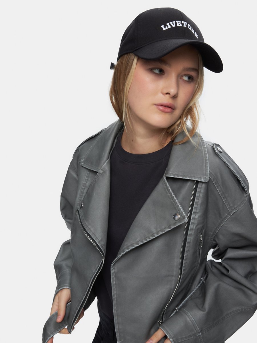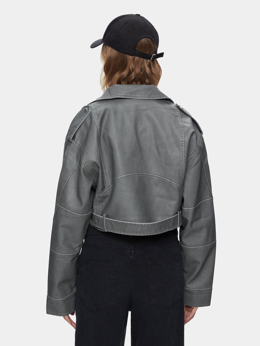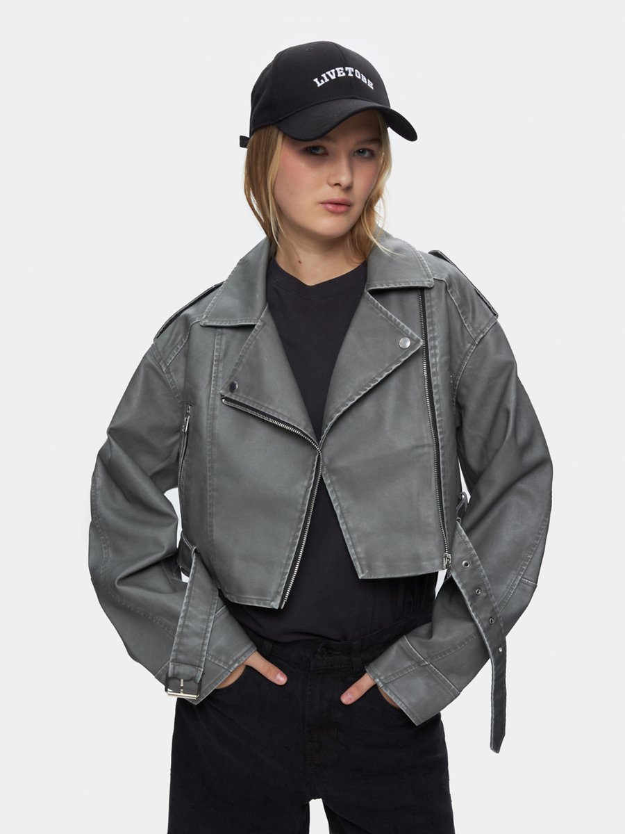 Effet Délavé Col Cubain À Fermeture Éclair Grıs Veste
