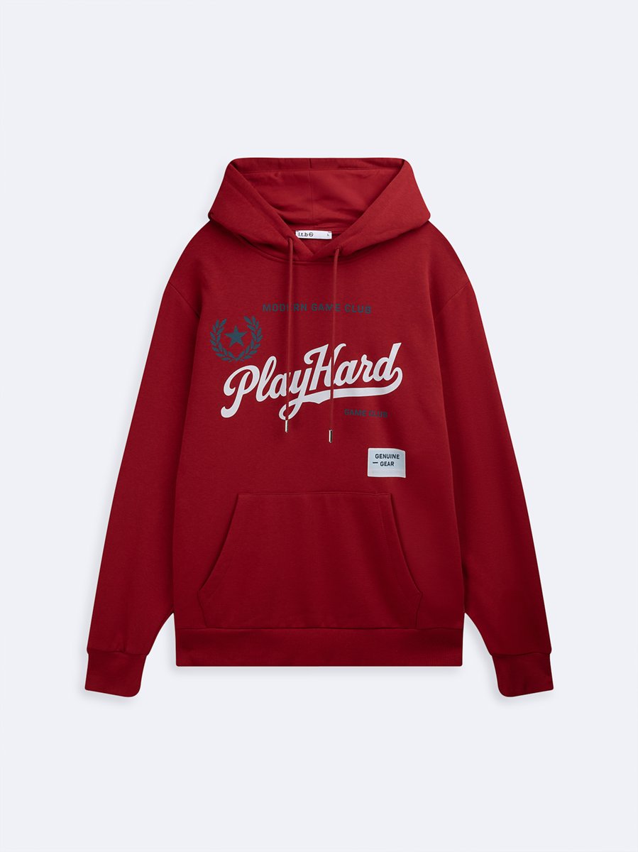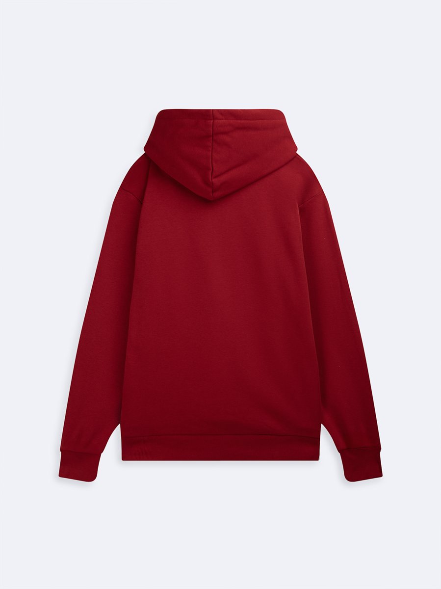 Uzun Kollu Kapüşonlu Slogan Baskılı Kırmızı Sweatshırt
