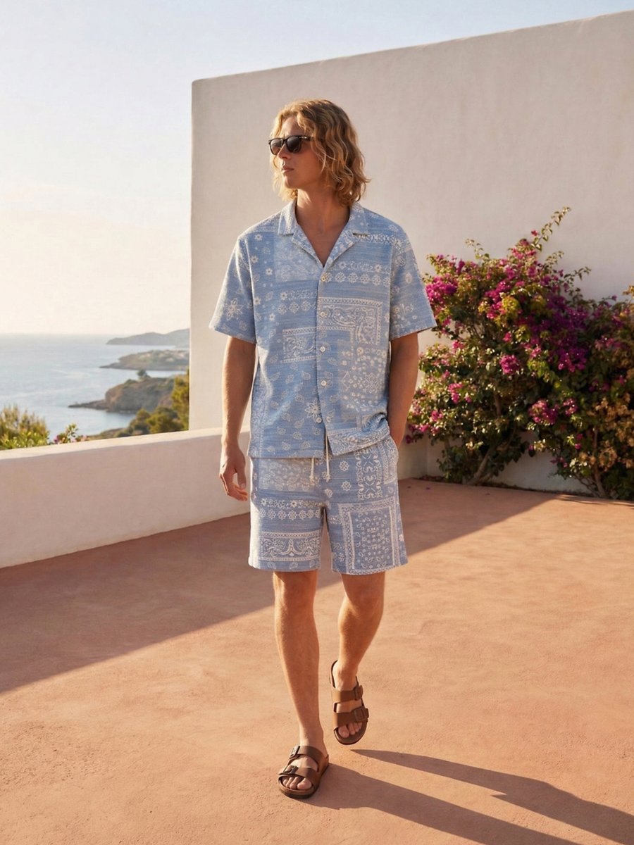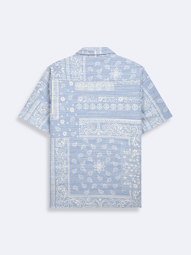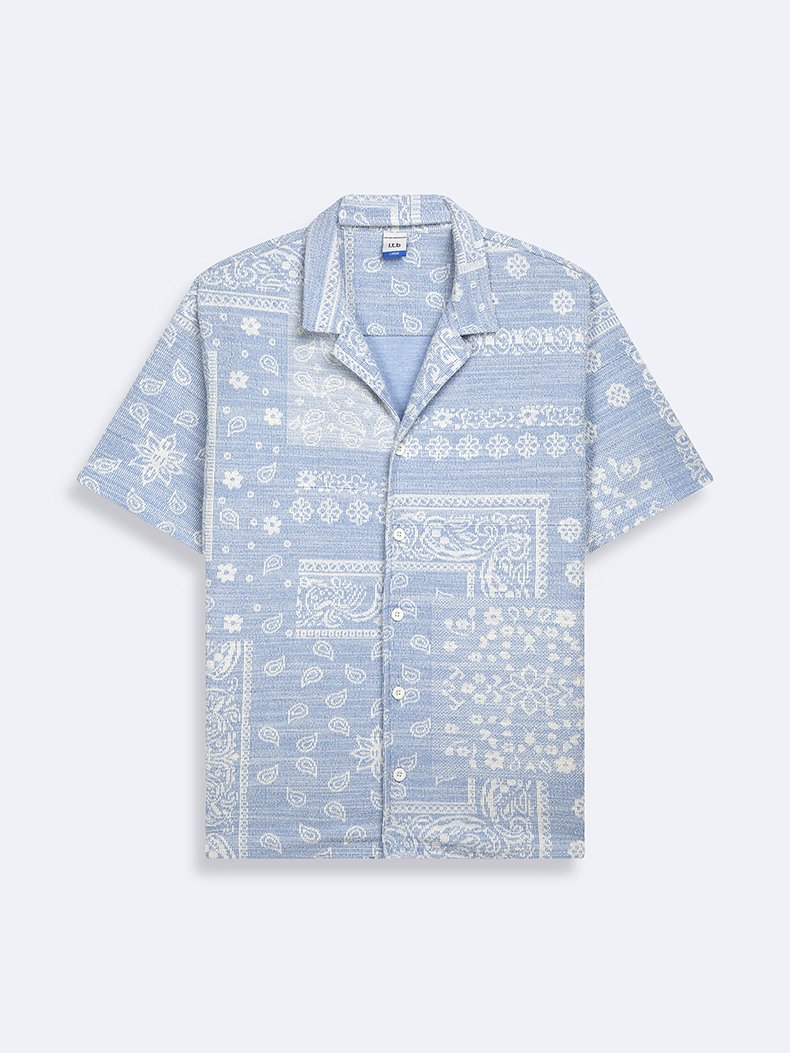 Şal Desenli Küba Yaka Kısa Kollu Açık Mavi Gömlek