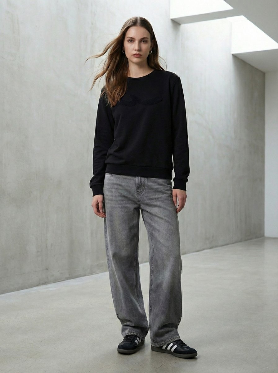 Sign Baskılı Uzun Kollu Bisiklet Yaka Siyah Sweatshırt