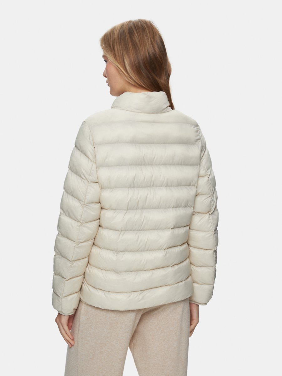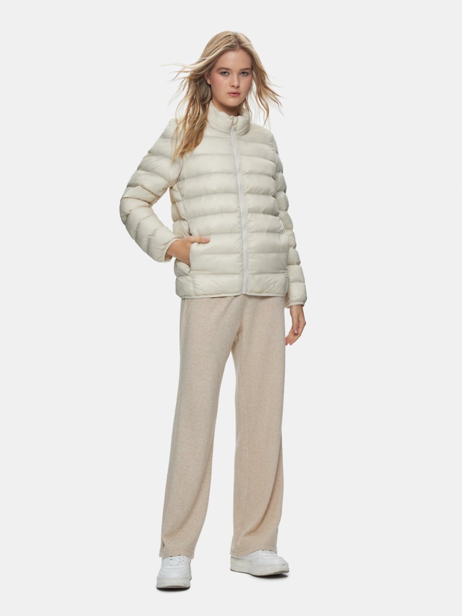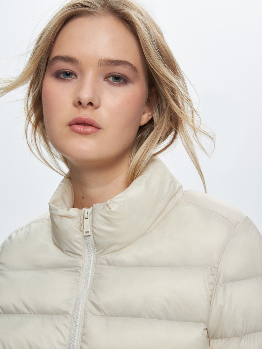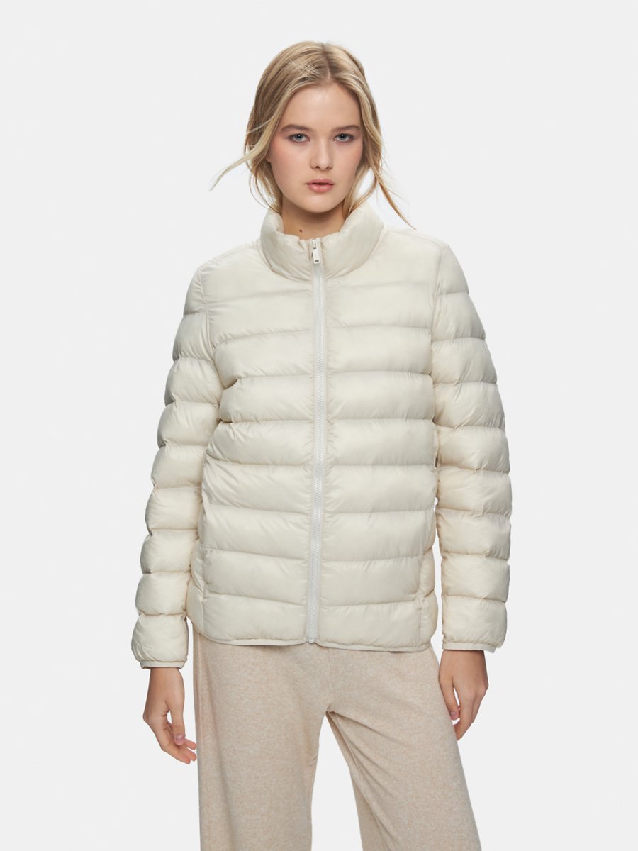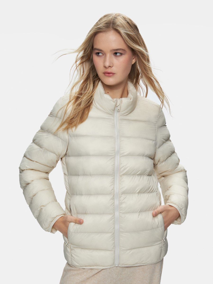 Uzun Kollu Fermuarlı Şişme Bej Mont