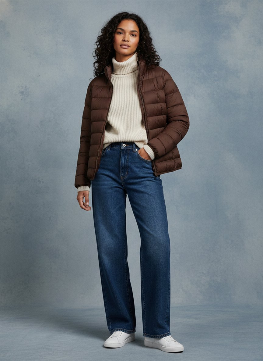Uzun Kollu Fermuarlı Şişme Kahverengi Mont