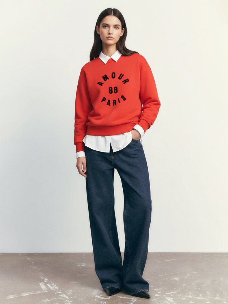Uzun Kollu Sıfır Yaka Slogan Baskılı Kırmızı Sweatshırt