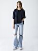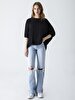 Yuvarlak yakalı, ön kısmı hafif kısa arkaya doğru daha uzun kesimli düşük omuzlu klasik bir t-shirt, vazgeçilmez bir ürün.